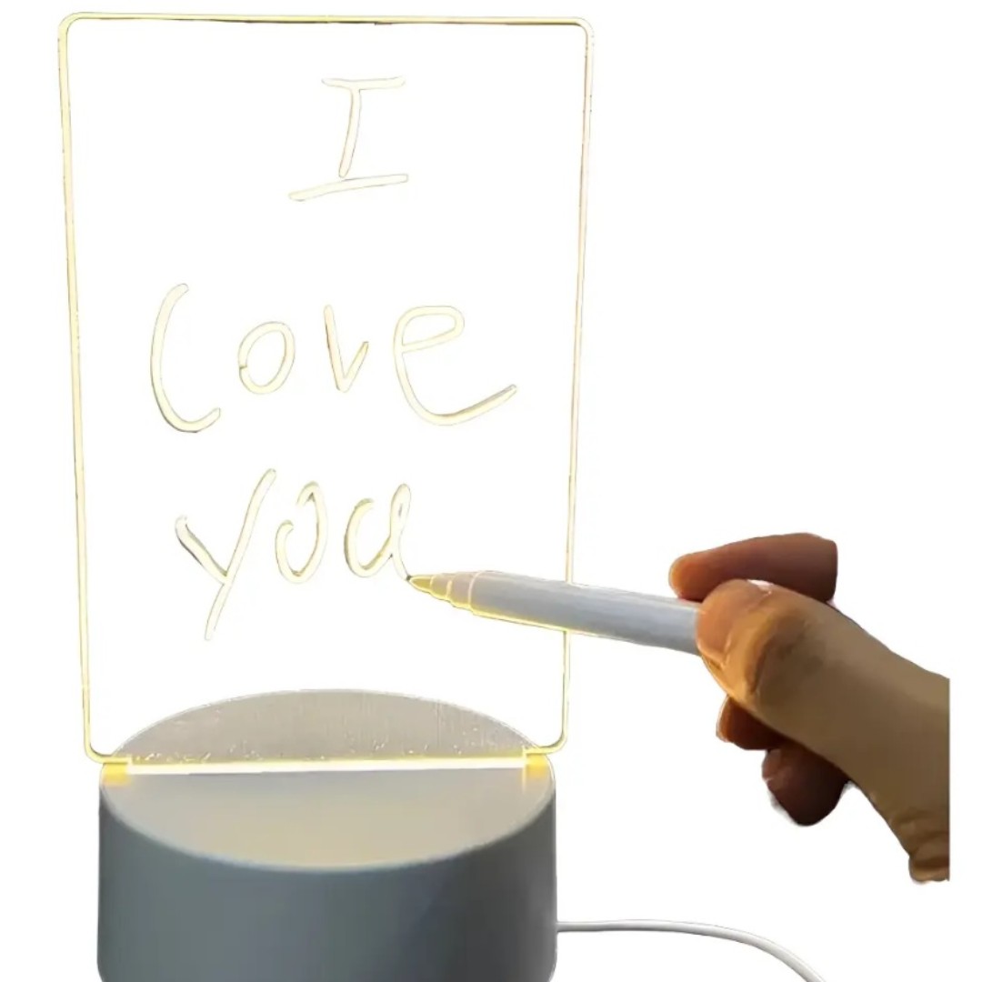 Esta lámpara de escritorio 3D acrílica transforma un diseño simple en una figura iluminada con efecto tridimensional, proyectando luz desde su base para crear un impacto visual único. Incluye un bolígrafo de tiza líquida con goma de borrar, permitiendo personalizar el acrílico con frases, dibujos o ilustraciones que cobran vida con luz y profundidad. Ideal para decorar escritorios, habitaciones, oficinas o ambientar eventos como cumpleaños y fiestas temáticas, combina funcionalidad y estilo. La base blanca, resistente y duradera, se conecta mediante cable USB incluido, haciendo que dibujar, iluminar y sorprender sea fácil. Tu creatividad no tendrá límites.