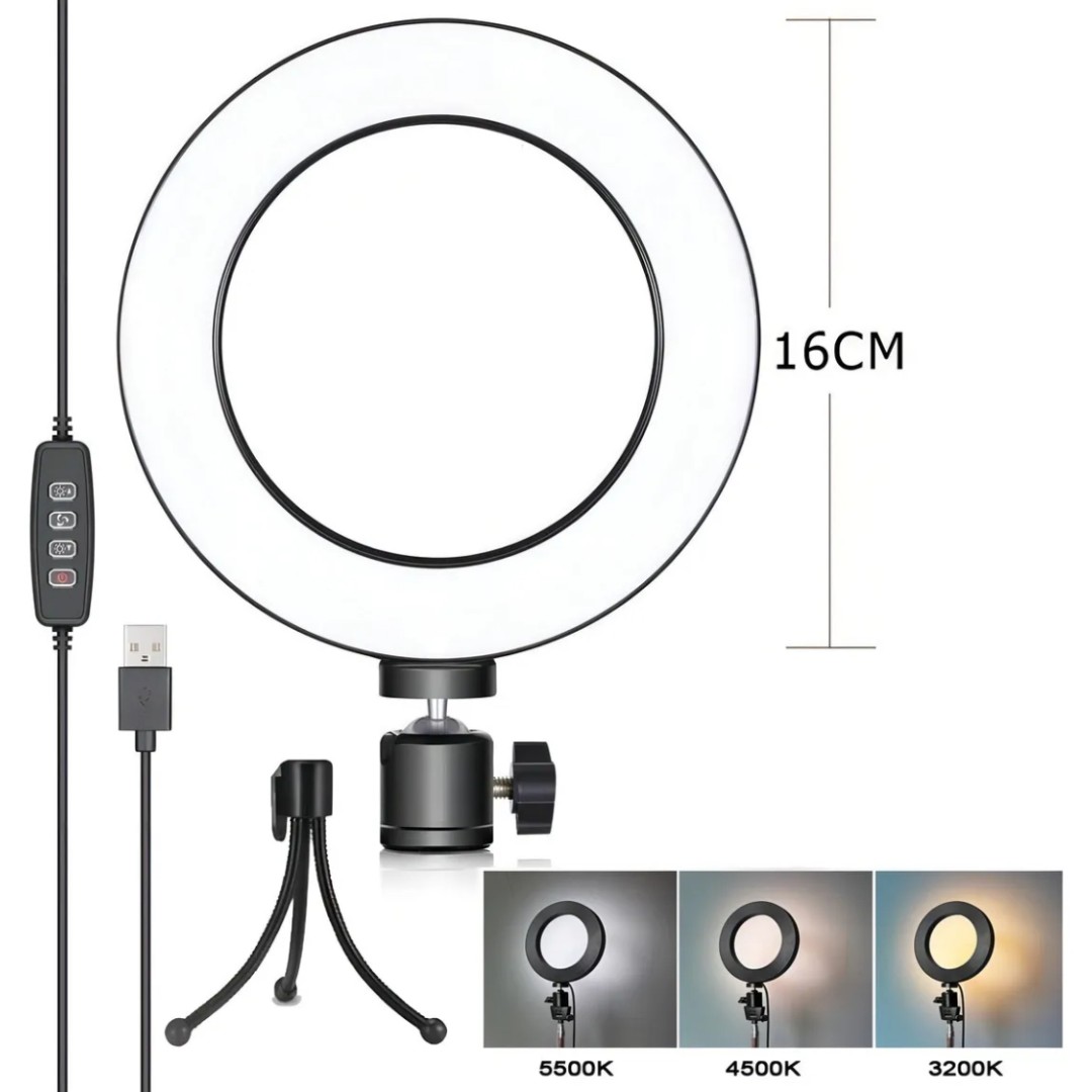 Potencia tu espacio con el aro de iluminación LED premium, ideal para maquillaje, fotografías o simplemente para darle un toque especial a tus ambientes. Su diseño compacto y funcional te permite regular tanto la intensidad como la temperatura de color, eligiendo entre luz fría, neutra o cálida según la ocasión. Incluye un trípode ajustable que se adapta fácilmente a distintos ángulos, ofreciendo comodidad y versatilidad en cada uso. Con un aro de 16 cm de diámetro y un soporte de 18 cm, este set compacto es perfecto para usar en escritorios o superficies reducidas, sin renunciar a una luz profesional.