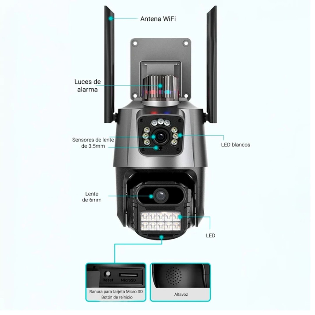 Protegé tu hogar o negocio con esta cámara de seguridad doble lente 4K, diseñada para ofrecer una vigilancia más completa, inteligente y confiable. Gracias a su sistema de doble lente, combina un lente fijo para monitoreo constante con otro de rotación 360°, logrando una cobertura total sin puntos ciegos.