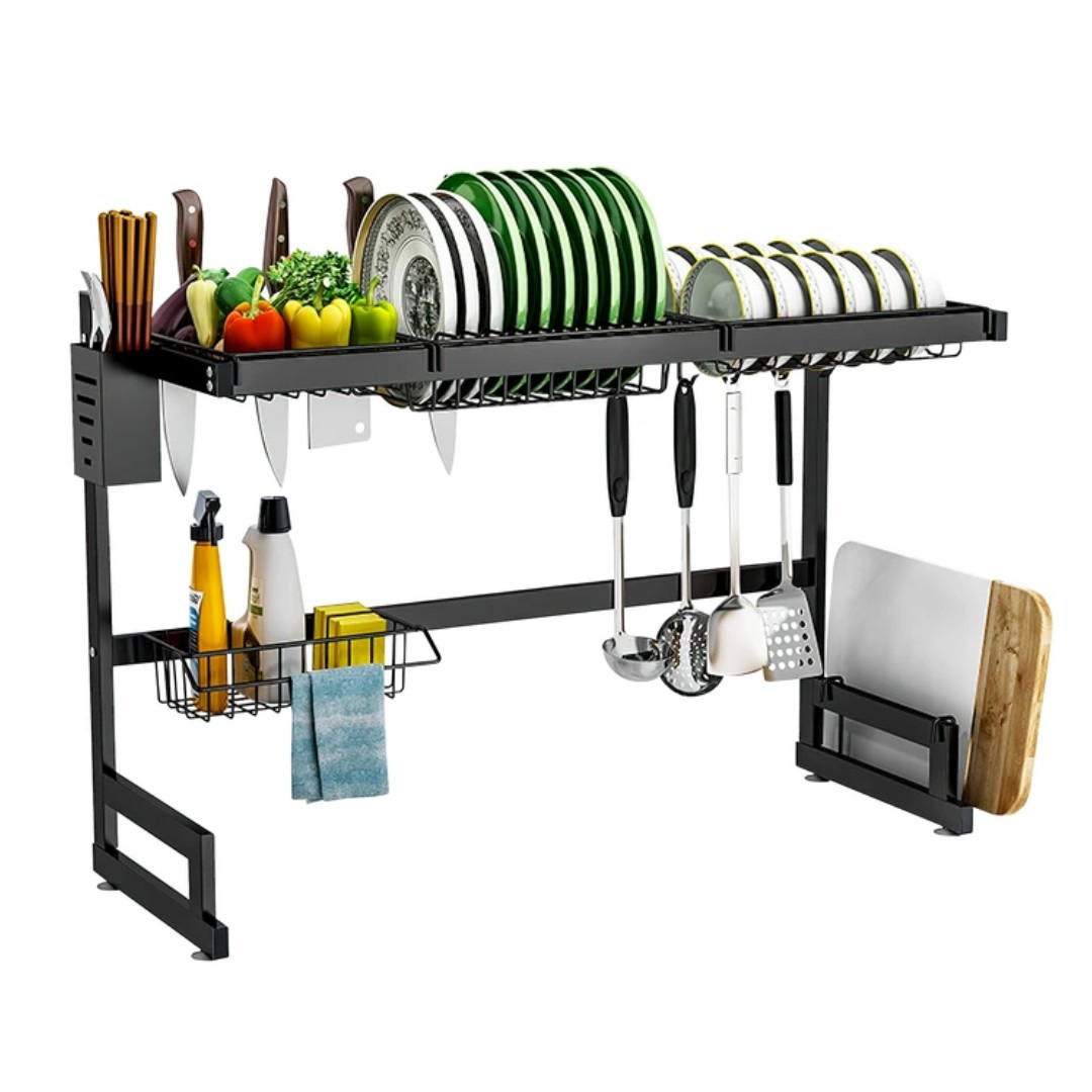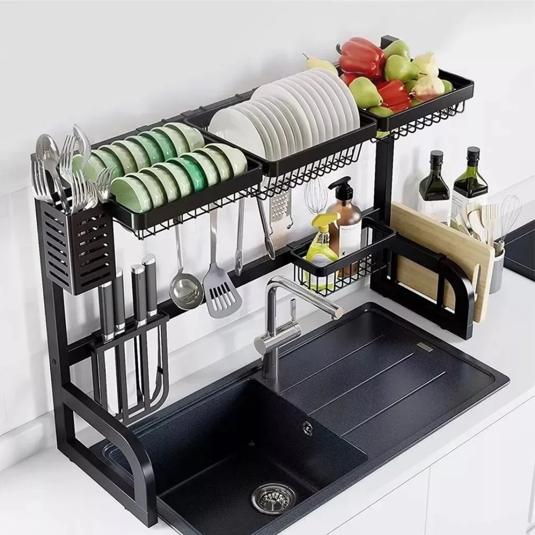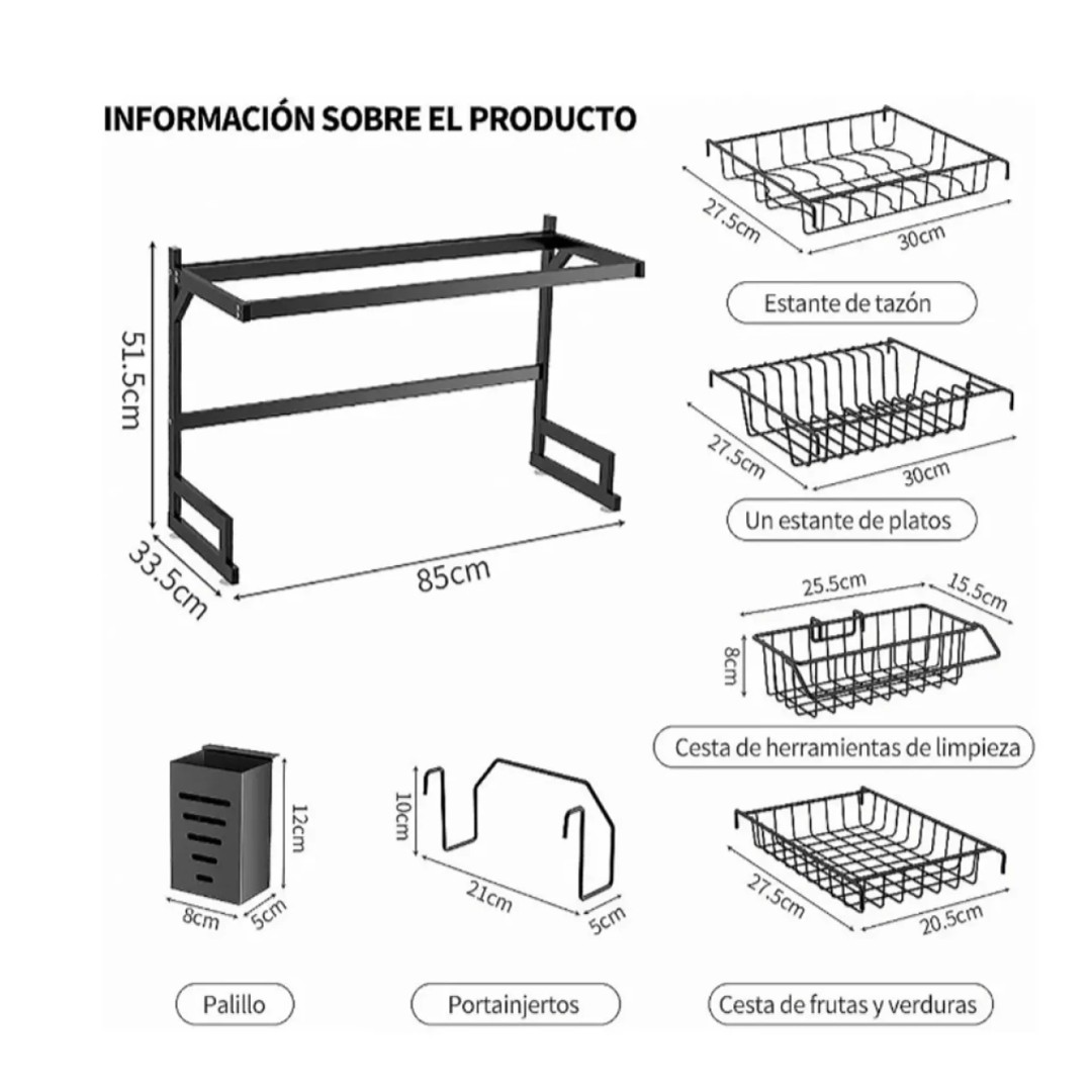 Mantén tu cocina ordenada y aprovecha mejor el espacio con este escurridor organizador para fregadero. Su diseño permite colocarlo sobre la pileta, optimizando el espacio de la mesada mientras secan los utensilios. Cuenta con varios compartimentos para platos, tazones, frutas o verduras, además de porta cubiertos y soporte para utensilios de cocina. Su estructura metálica resistente brinda estabilidad y durabilidad, siendo ideal para organizar platos recién lavados y mantener todo al alcance de forma práctica.