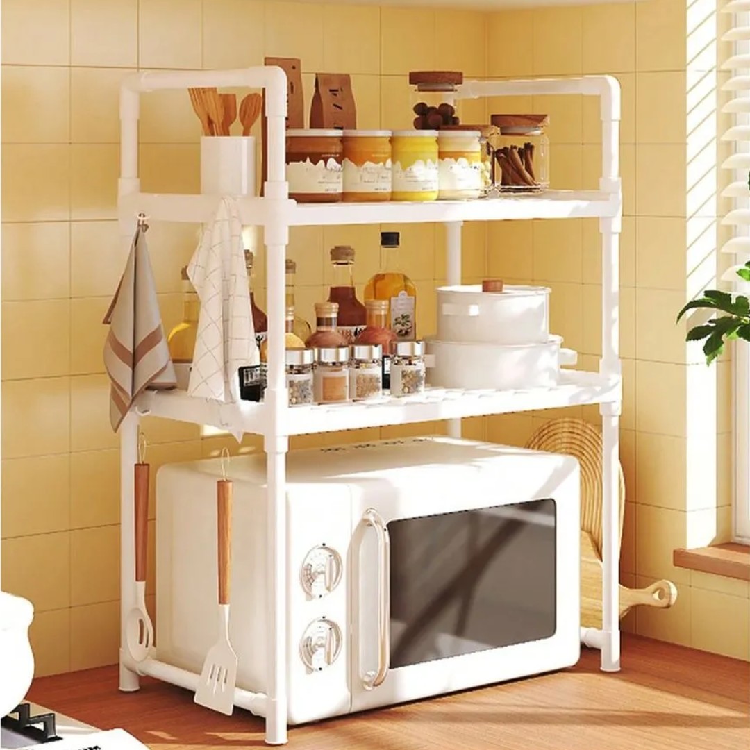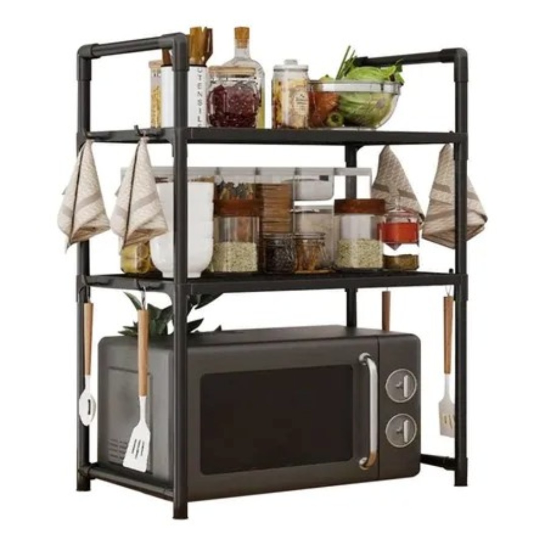 Este estante rack de 3 pisos es la solución perfecta para organizar tu cocina y aprovechar al máximo el espacio disponible. Diseñado especialmente para colocar el microondas en la parte superior, cuenta con dos estantes inferiores ideales para almacenar platos, vasos, ollas y otros utensilios, manteniéndolos siempre accesibles y ordenados. Su estructura compacta y funcional facilita la organización y hace que la preparación de tus comidas sea más práctica. Fabricado con materiales resistentes y duraderos, garantiza una larga vida útil y su montaje es sencillo, sin necesidad de herramientas especiales. Con este organizador, tendrás una cocina más ordenada y eficiente, evitando el desorden y ahorrando tiempo.