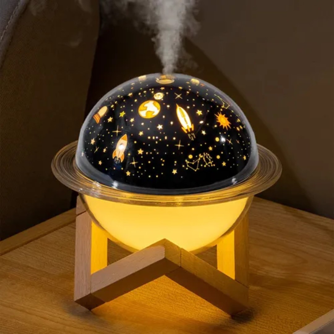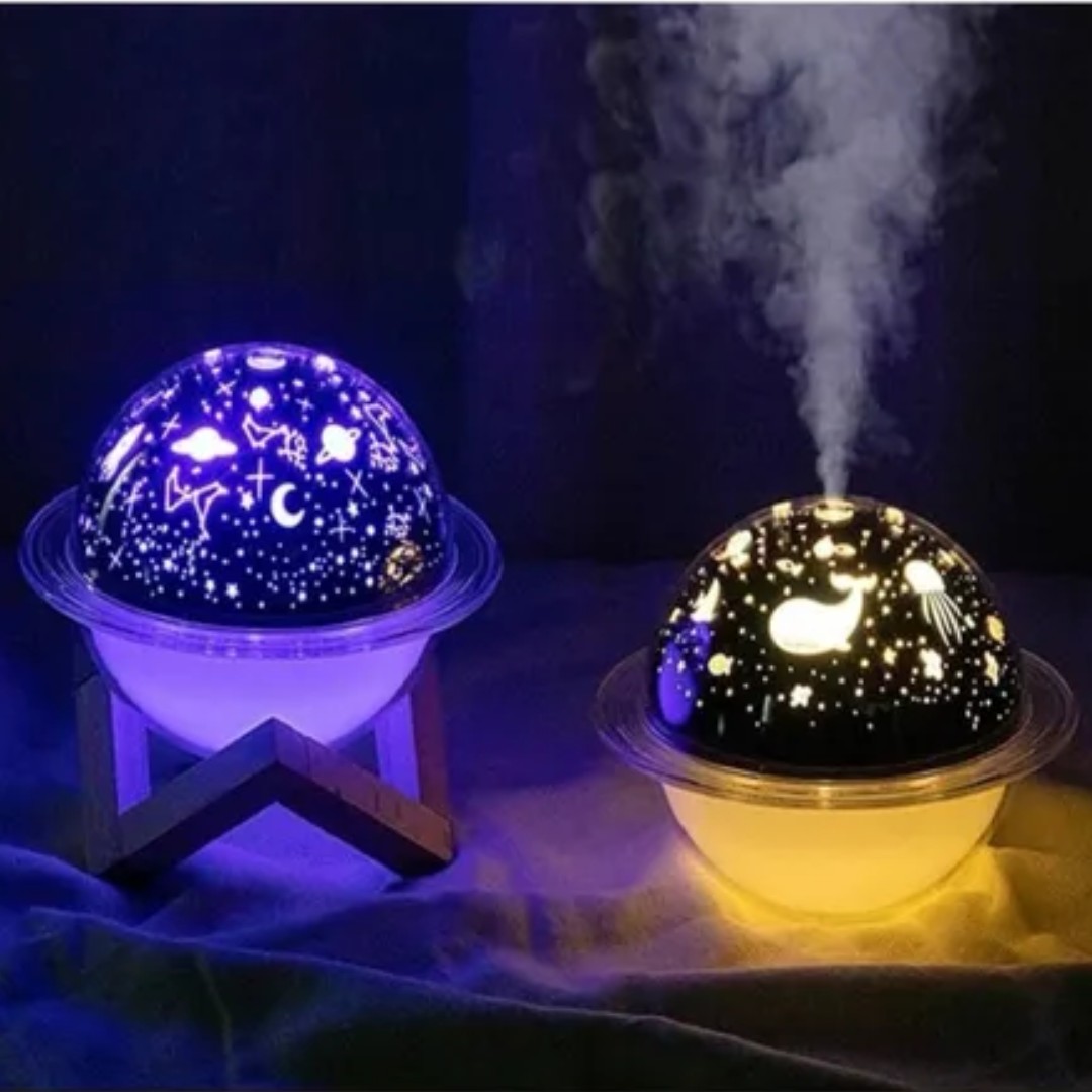 Este humidificador con diseño de planeta combina estilo y funcionalidad en un solo producto. Además de mantener el aire fresco y tu piel hidratada con una pulverización silenciosa de hasta 50 ml/h, también funciona como luz nocturna y proyector, creando una atmósfera romántica y relajante ideal para descansar.