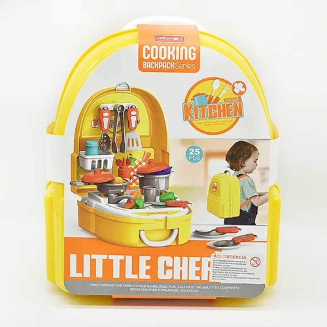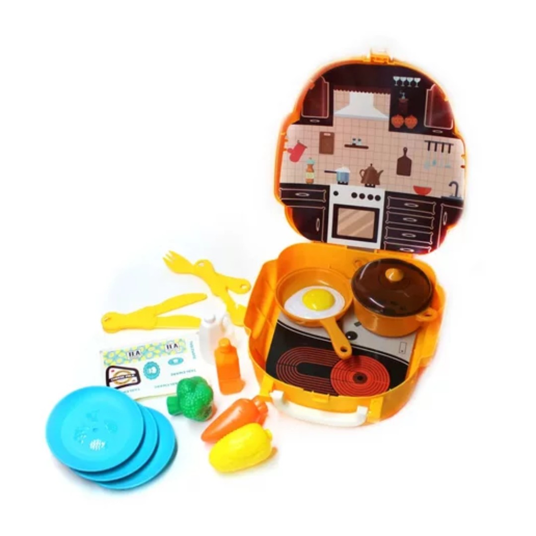 Este maletín con accesorios de cocina es ideal para que los niños desarrollen su creatividad y disfruten del juego de simulación como pequeños chefs. Está fabricado en plástico resistente y seguro, sin puntas afiladas, y tiene un diseño inteligente que permite convertir el morral en un bolso o en una mesa de herramientas para facilitar el juego.