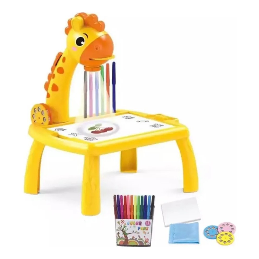 La Pizarra Mágica Mesita con Proyector Jirafa es un juguete educativo e interactivo diseñado para que los niños aprendan y se diviertan al mismo tiempo. Proyecta distintos dibujos que los pequeños pueden calcar y colorear, lo que estimula la creatividad y mejora la coordinación motora. Incluye 24 imágenes divididas en 3 discos, una base con compartimentos para guardar los marcadores y los discos, y un borrador para reutilizar la pizarra cuantas veces se desee.