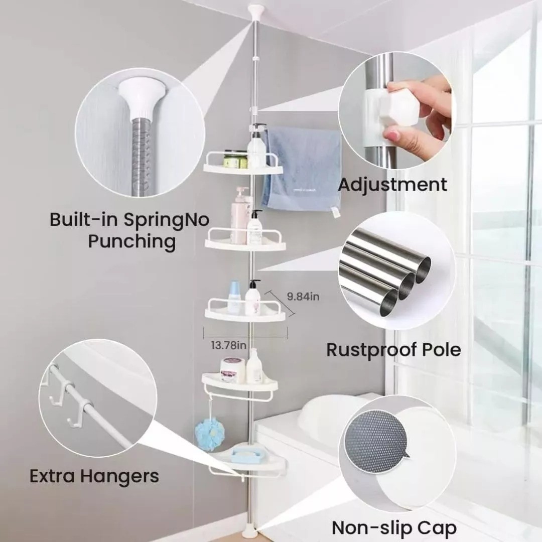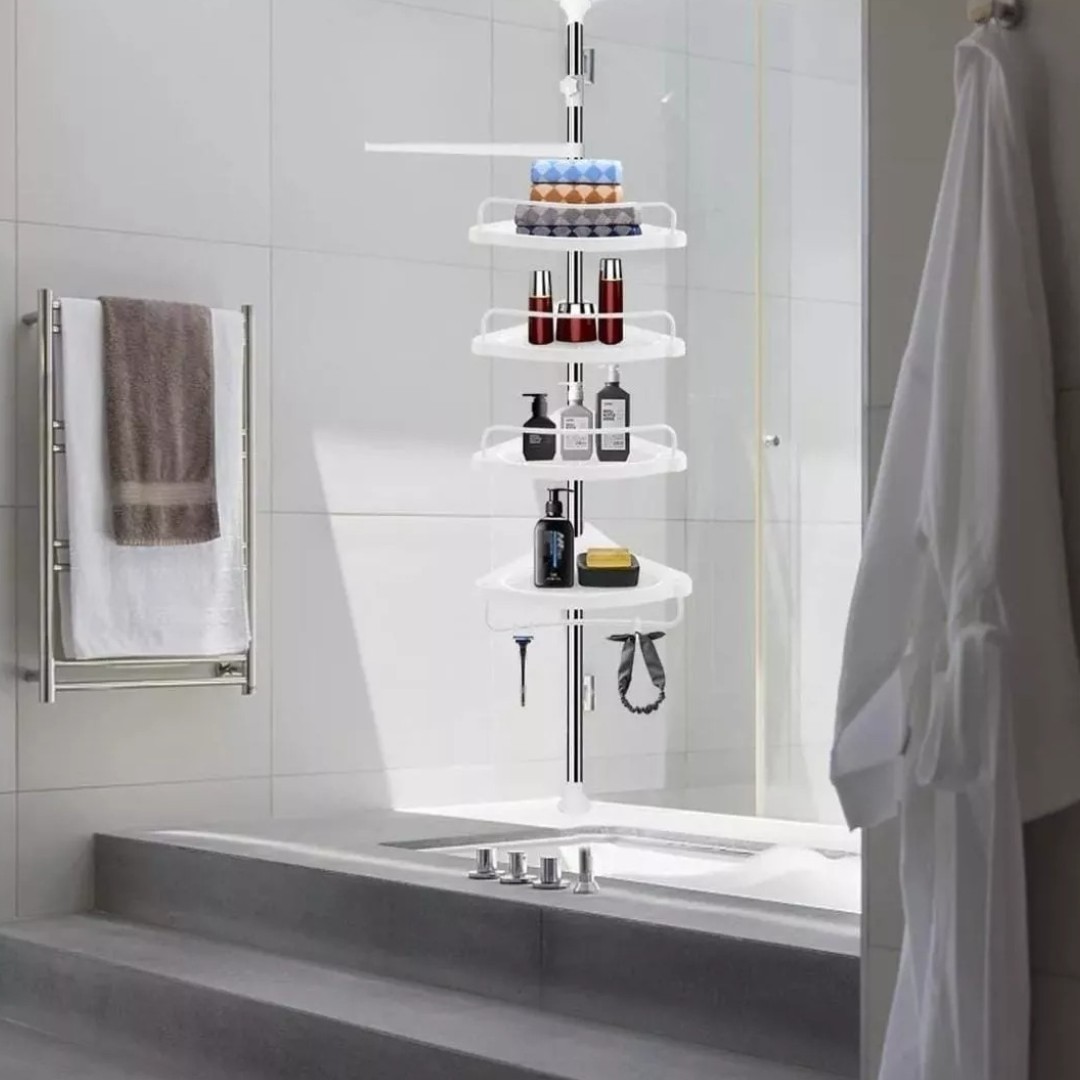 Este organizador esquinero para baño o ducha es ideal para espacios reducidos. Ajustable hasta 2,6 m, ofrece cuatro niveles regulables para almacenar productos de higiene o limpieza. Fabricado con tubos de metal y accesorios plásticos, se fija fácilmente en cualquier esquina gracias a sus cabezales antideslizantes con goma suave. Práctico, resistente y fácil de instalar.