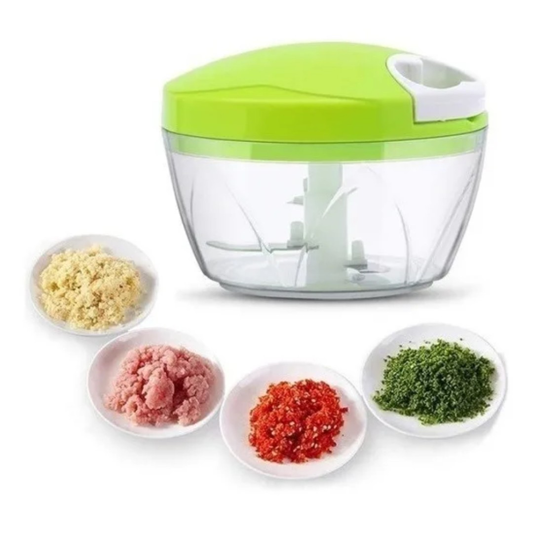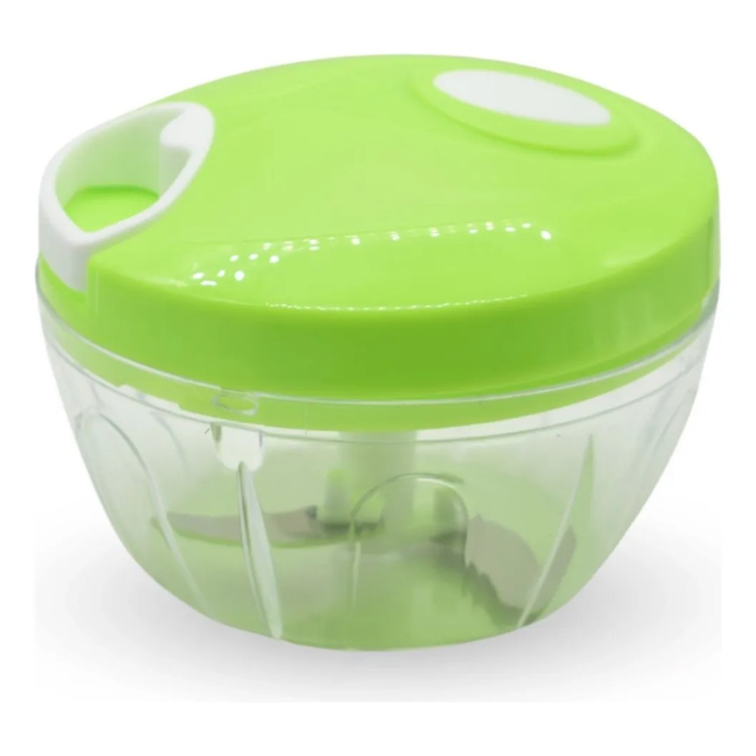 Este mini procesador de alimentos manual es una herramienta práctica y compacta ideal para el uso diario en la cocina. Funciona sin electricidad: solo hay que colocar los ingredientes en su recipiente de acrílico, cerrar la tapa y tirar del cordón retráctil unas pocas veces para picar o triturar de forma eficiente. Cuenta con tres cuchillas de acero inoxidable que garantizan un corte rápido y uniforme. Su diseño es resistente, fácil de limpiar y ocupa muy poco espacio, lo que lo convierte en una excelente opción para cocinas pequeñas o para quienes buscan practicidad. Medidas aproximadas: 12 x 8 x 13 cm.