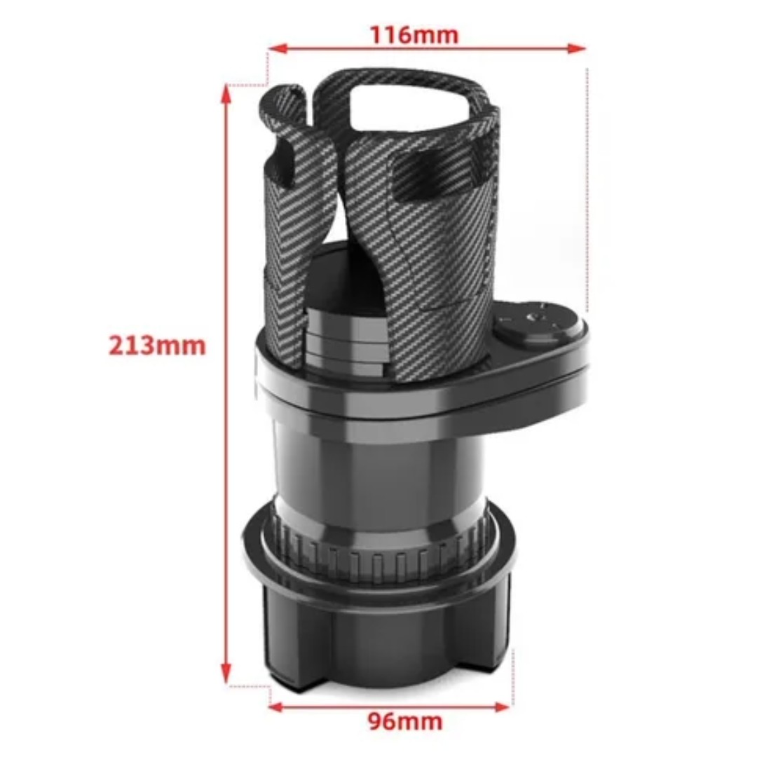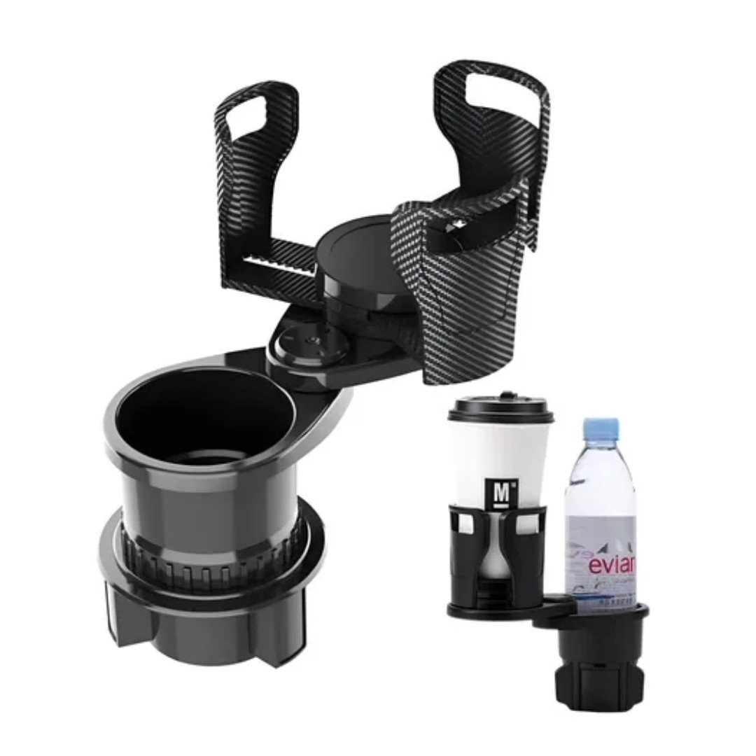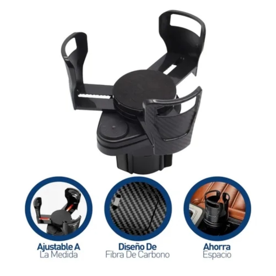 Su diseño expandible se adapta al portavasos original del vehículo y agrega espacio adicional para llevar bebidas, botellas, café o latas de forma segura. Cuenta con base ajustable para un mejor encastre y estabilidad durante el viaje. Incluye un soporte superior adaptable para distintos tamaños de vasos o botellas, ideal para evitar derrames.