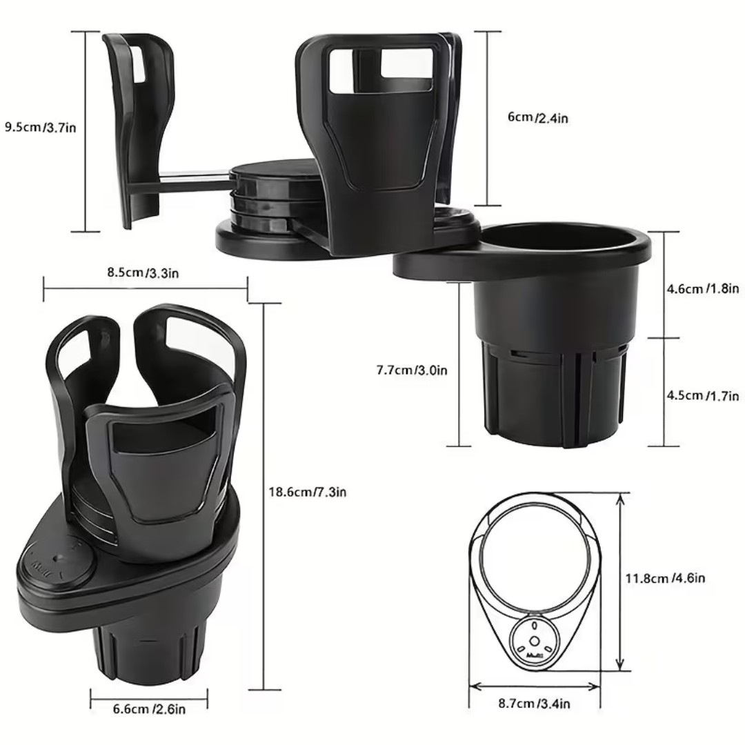 Su diseño práctico se coloca fácilmente en el portavasos original del vehículo y permite agregar espacio adicional para llevar bebidas, botellas o café de forma segura. Cuenta con brazos ajustables que se adaptan a distintos tamaños de vasos, latas o botellas, brindando mayor estabilidad durante el viaje. Su base giratoria permite acomodarlo según la necesidad sin ocupar demasiado espacio.