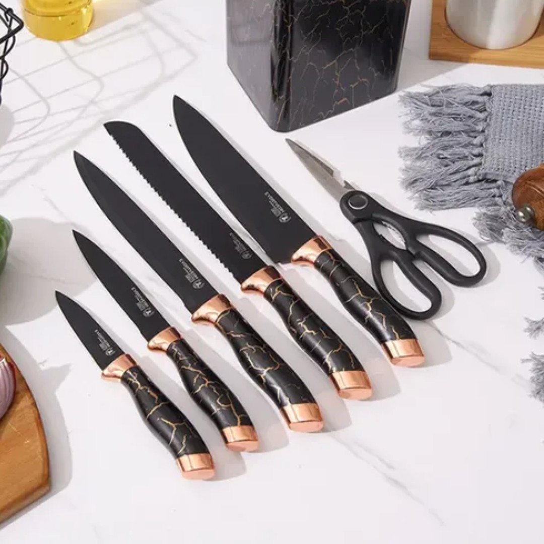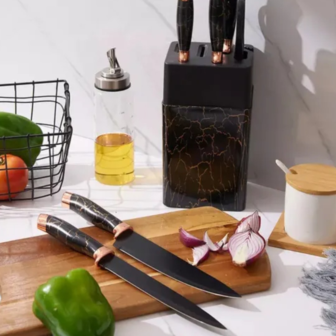 El set de cuchillas Rich Chef es la opción ideal para equipar tu cocina con herramientas prácticas, resistentes y de excelente rendimiento. Incluye diferentes tipos de cuchillos diseñados para cada uso: cortar carnes, picar verduras o preparar alimentos con precisión. Sus hojas de acero inoxidable garantizan durabilidad y filo prolongado, mientras que los mangos ergonómicos brindan un agarre cómodo y seguro. Además, su diseño moderno aporta estilo y organización a tu cocina, siendo perfecto tanto para uso diario como para regalar.