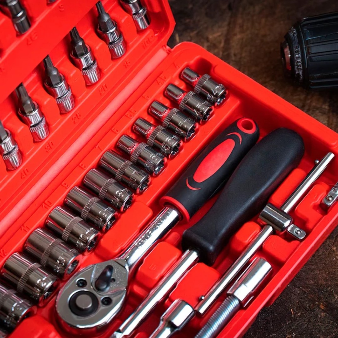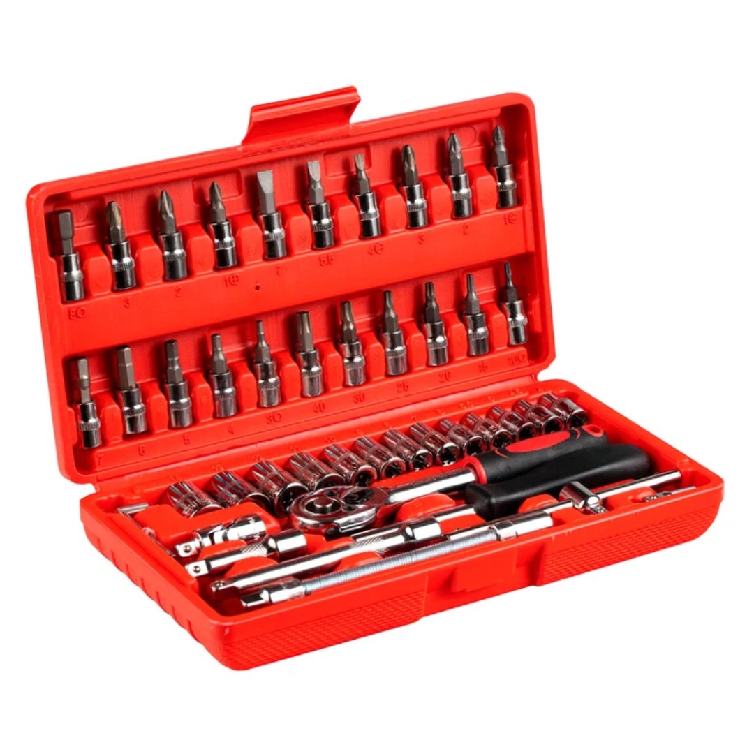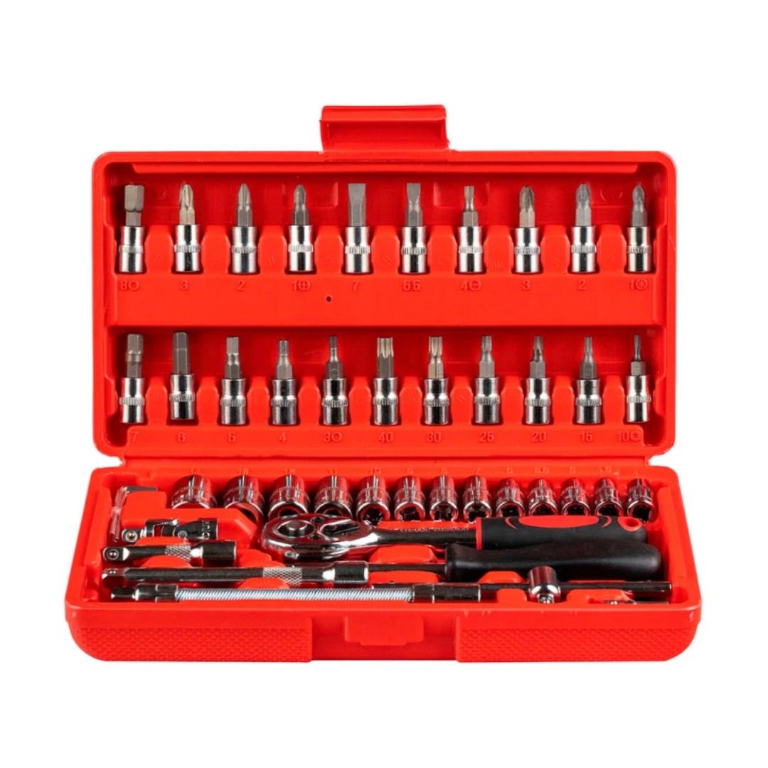 El set de herramientas de 46 piezas es un kit práctico y completo ideal para trabajos de mantenimiento, reparaciones mecánicas y tareas de armado en el hogar. Incluye una llave cricket de 1/4”, dados, puntas de destornillador, extensiones y llaves Allen que permiten trabajar con distintos tipos de tornillos y tuercas. Todas las piezas están fabricadas en acero con acabado cromado para mayor resistencia y durabilidad. Además, el set viene en un práctico maletín rígido que mantiene cada herramienta ordenada y facilita su transporte y almacenamiento. Es una solución versátil tanto para aficionados como para uso profesional.